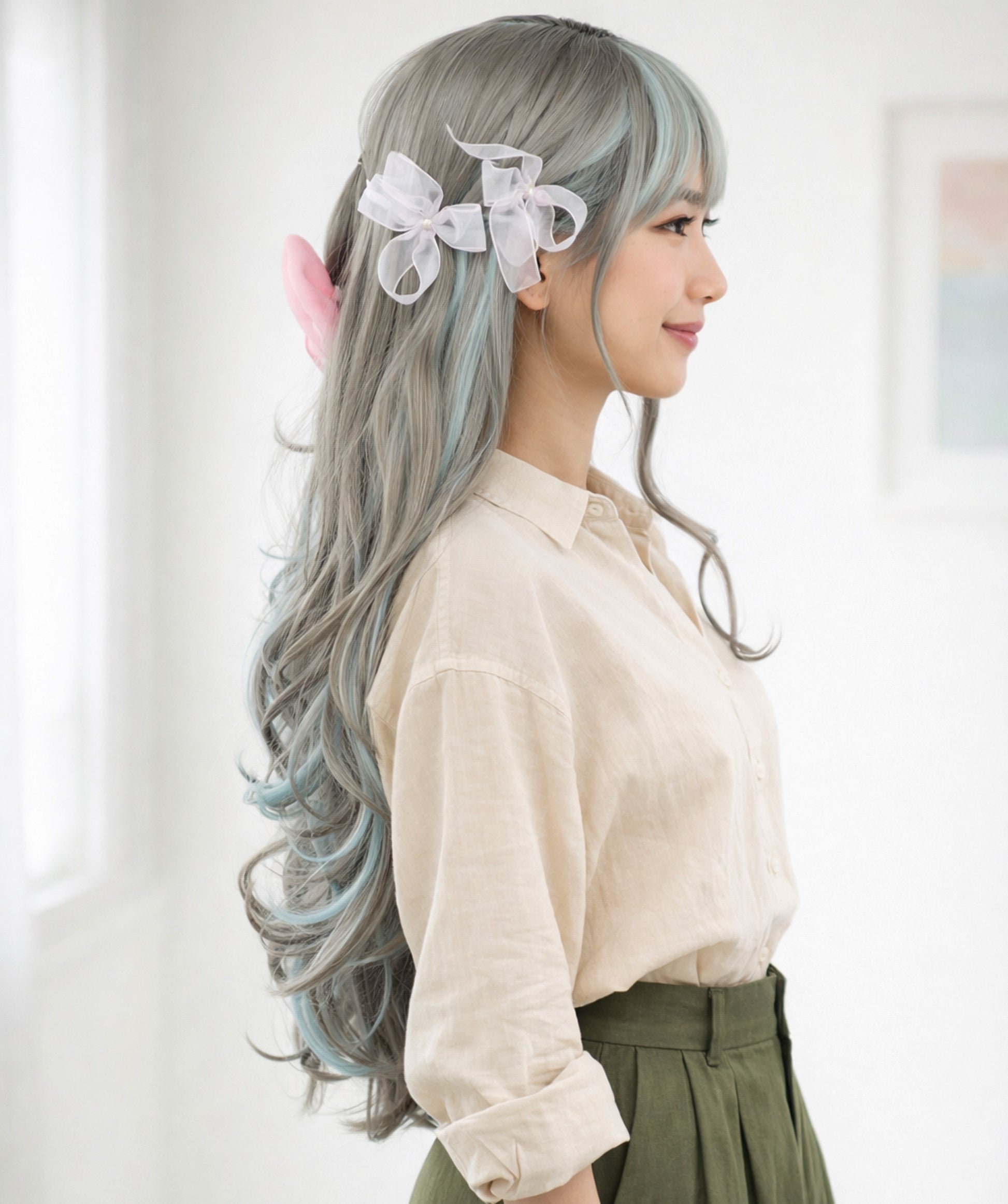 耐熱性合成繊維を丁寧に編み込んだこのウェーブウィッグは、柔らかなグレートーンと繊細なブルーのハイライトが絶妙なバランスで、洗練された印象を演出します。