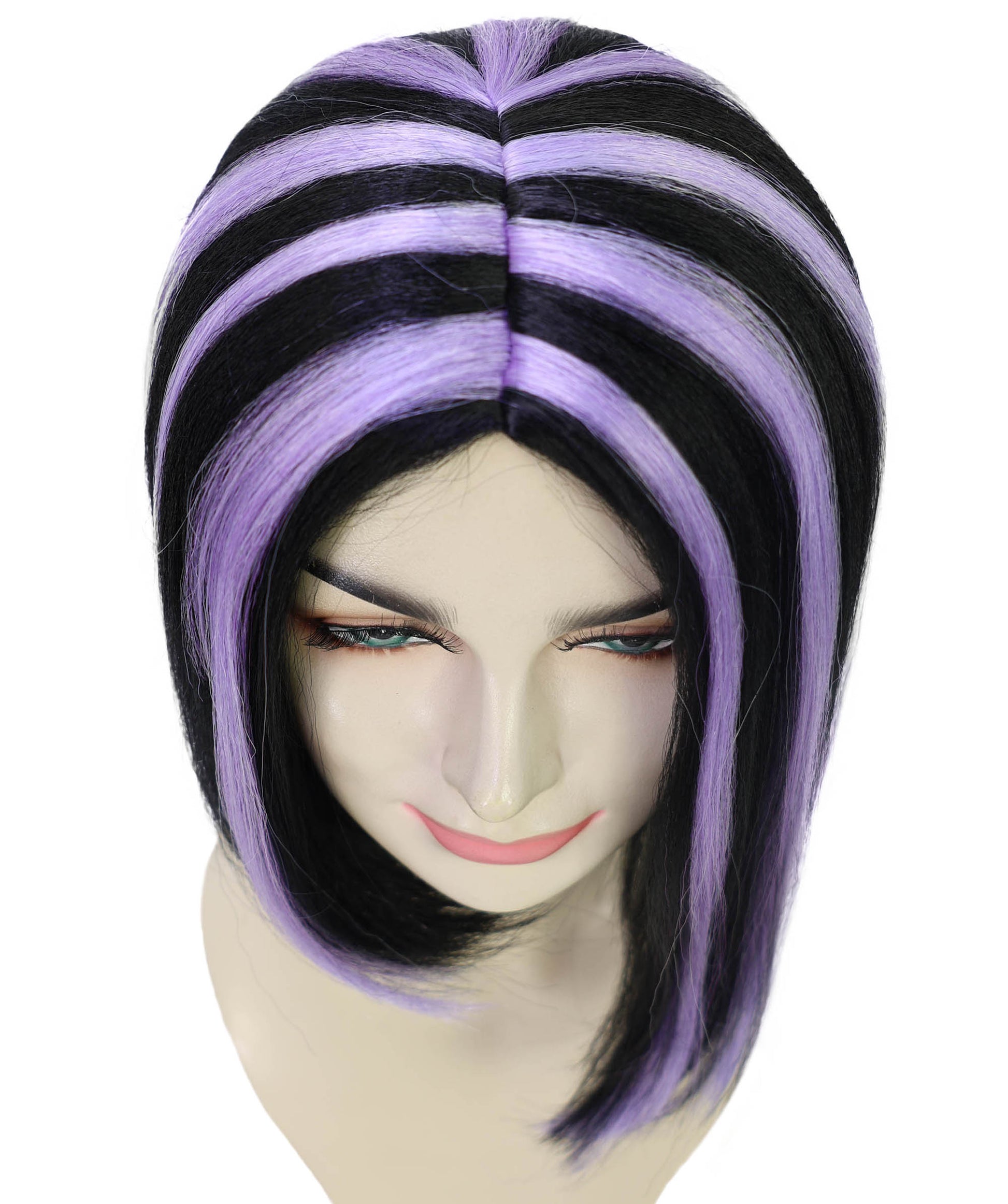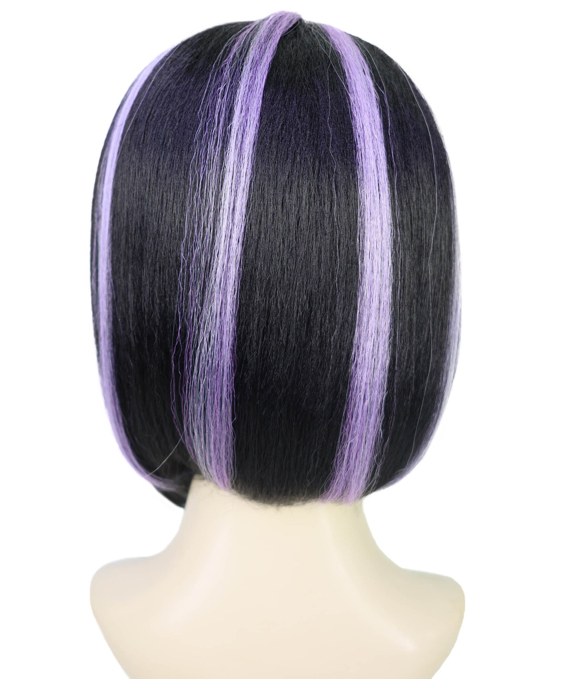 顎丈のすっきりとしたカットと滑らかな仕上がりが特徴のこのボブウィッグは、深みのあるブラックトーンに、印象的なホワイトとパープルのストライプを織り交ぜ、鮮やかでエッジの効いた印象を与えます。