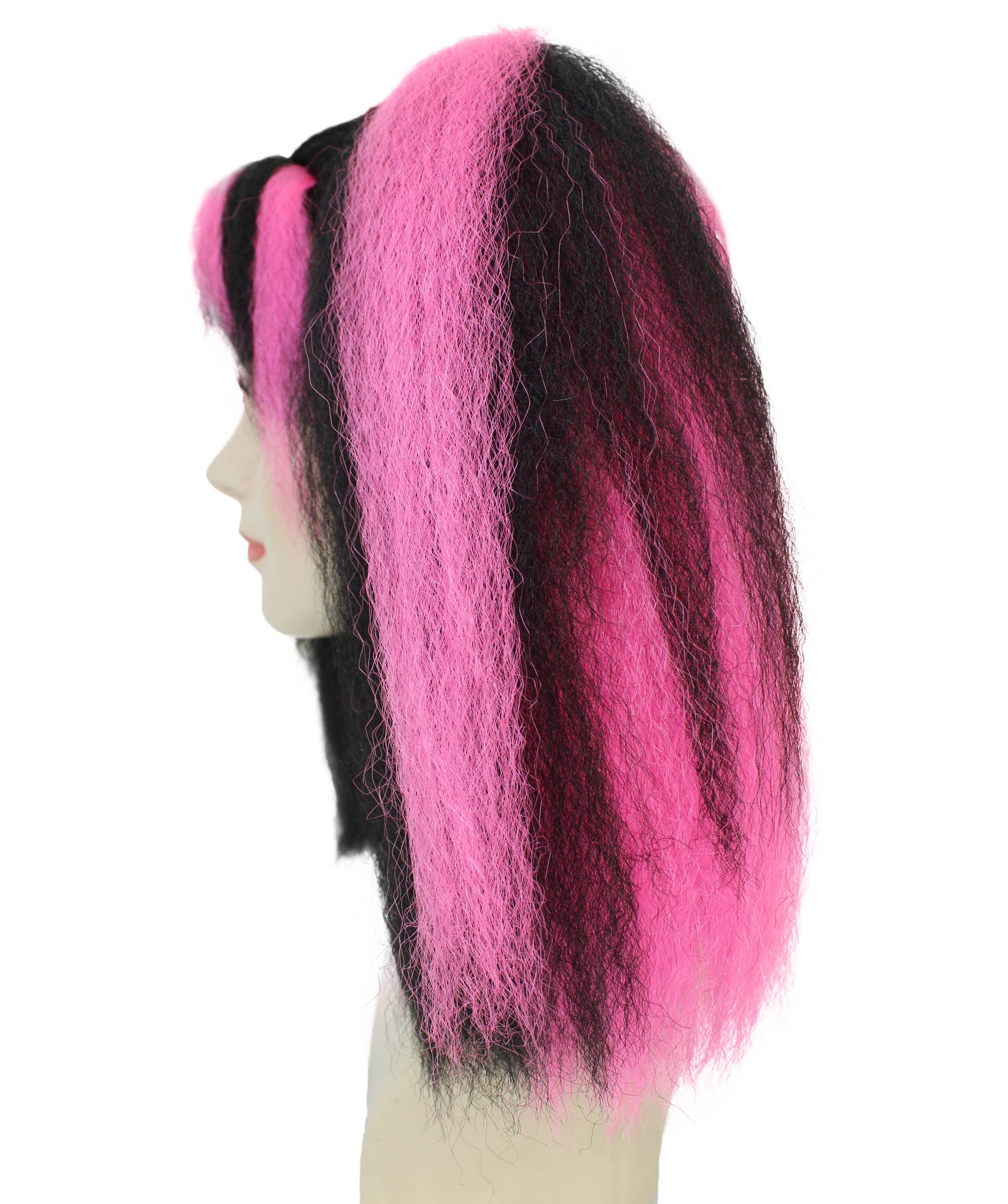 ポニーテールは太く滑らかで、印象的なピンクのストライプがアクセントとなり、ダークなベースカラーに鮮やかなコントラストとエネルギーを添えています。テーマパーティーやフェスティバルを愛する人のためにデザインされたこのウィッグは、遊び心と力強さを兼ね備えた、存在感のあるヘアスタイルを実現します。