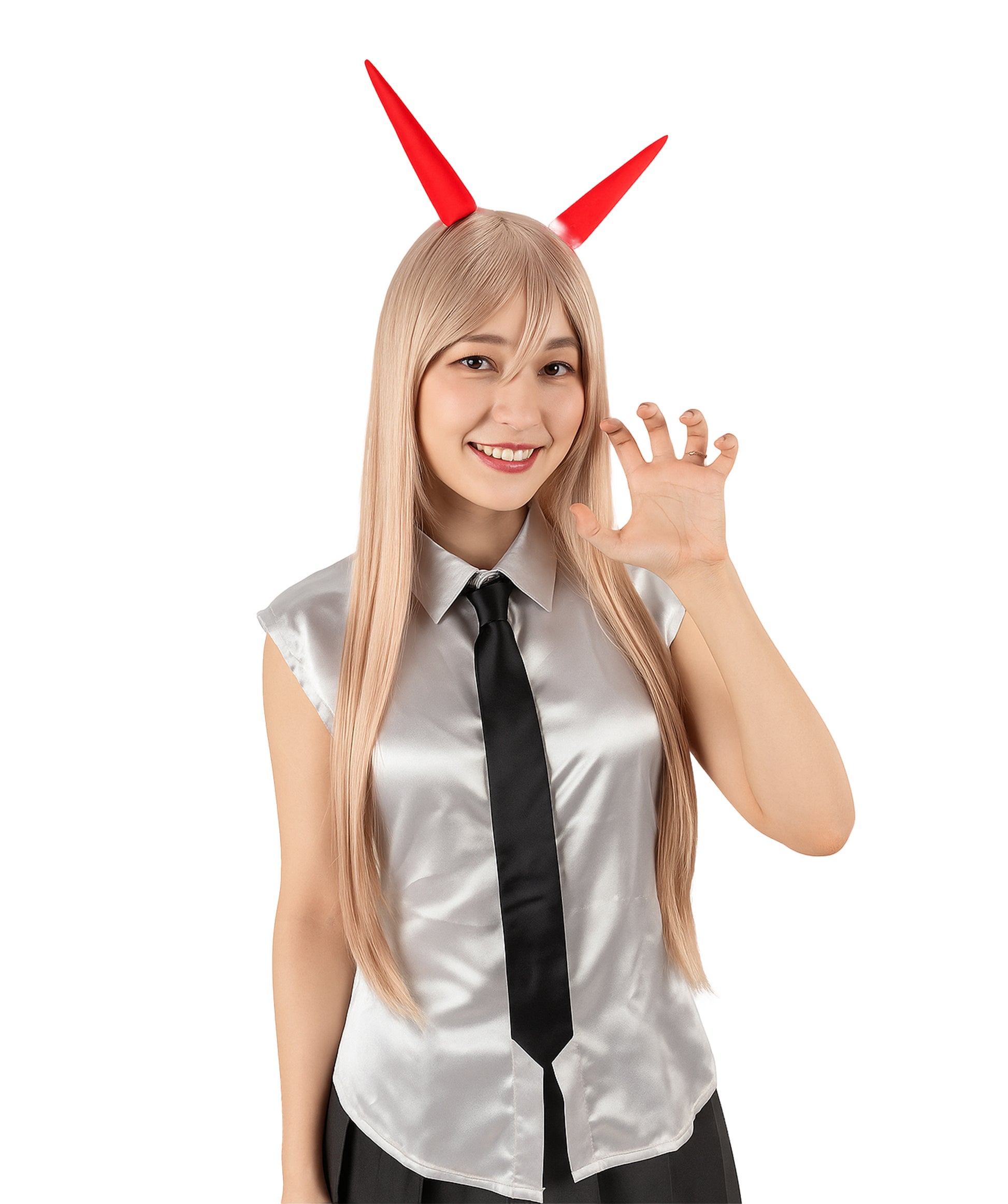 大人向け女性用 H-5812 チェーンソー マンガ アニメ デビル ガール ブロンド ウィッグ(角付き) ハロウィンおよびアニメテーマのグループパーティに最適 難燃性合成ファイバー