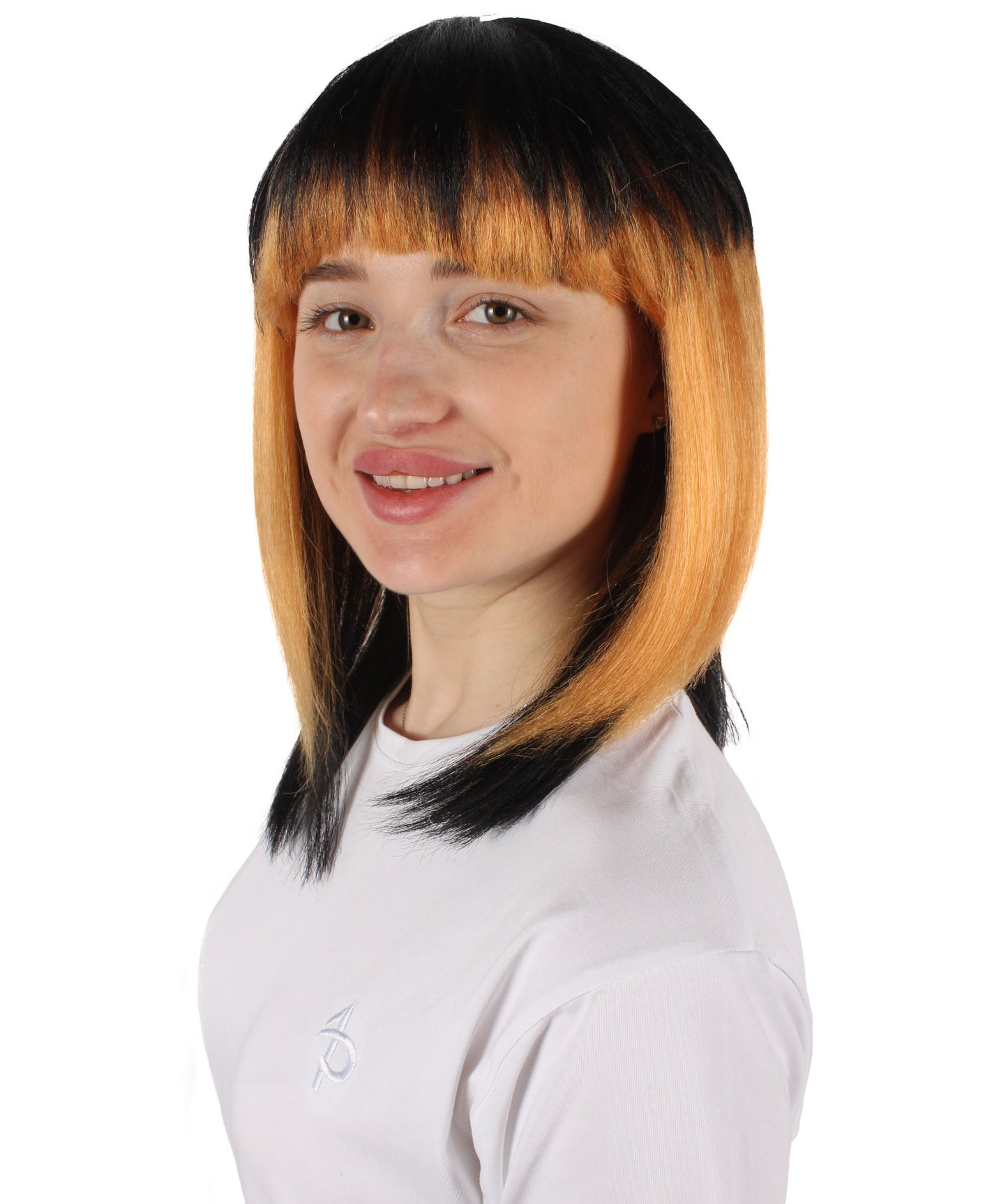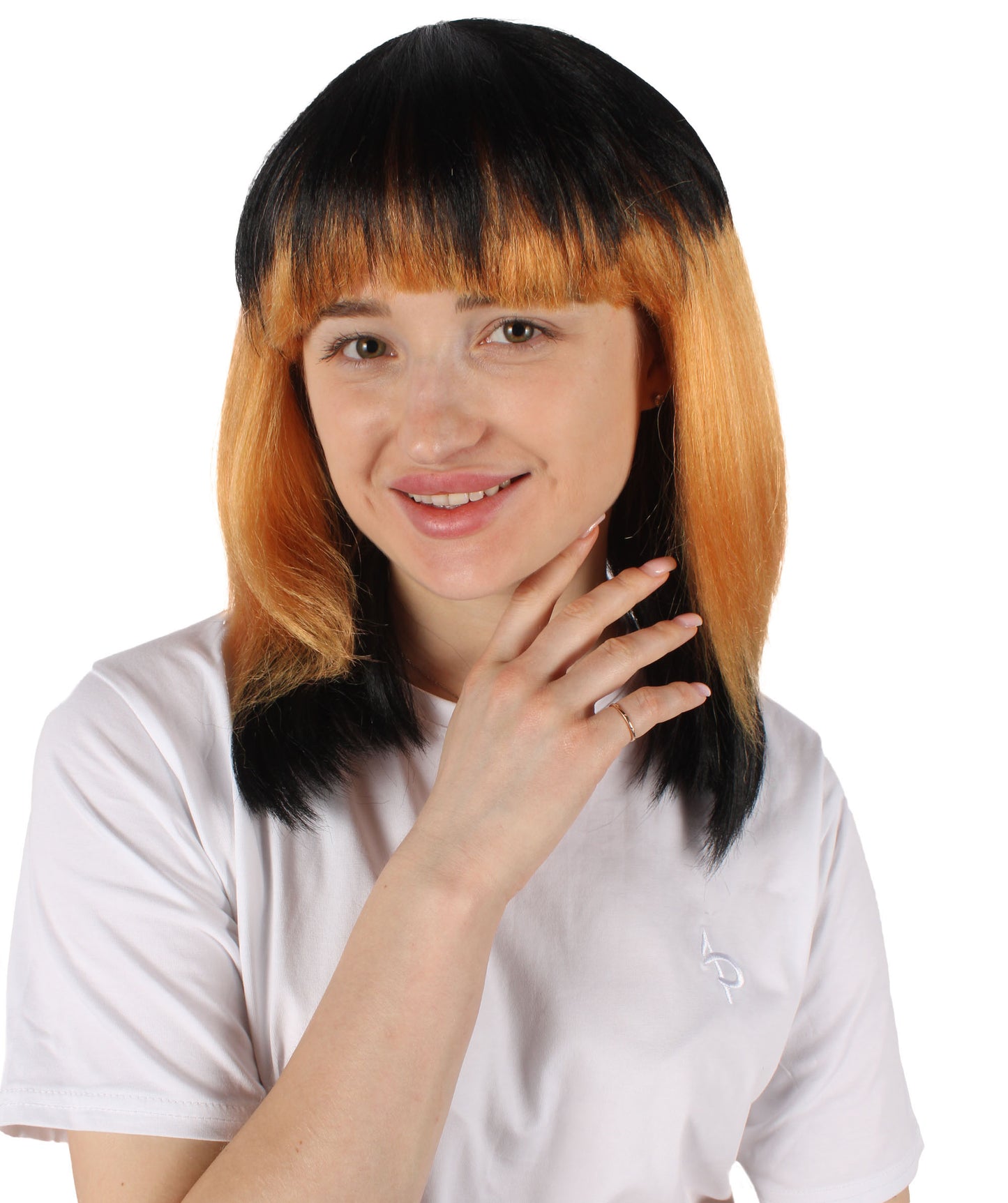 「ブラック&ブラウンのツートンウィッグと前髪のご紹介。ハロウィンコスプレやテーマパーティーのコスプレの見た目を格上げするコツです。このウィッグは魅惑的な黒と茶色の色合いの組み合わせで、印象的なコントラストを生み出し、見た目に深みを加えます。前髪の組み込みにより、洗練さと柔軟性が加わり、簡単にさまざまな個性や人々と交流することができます。