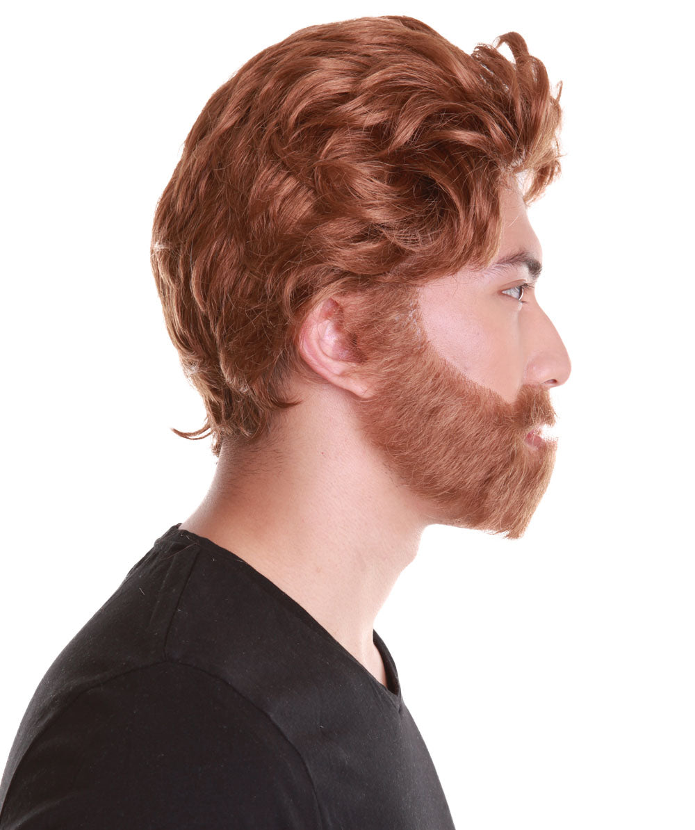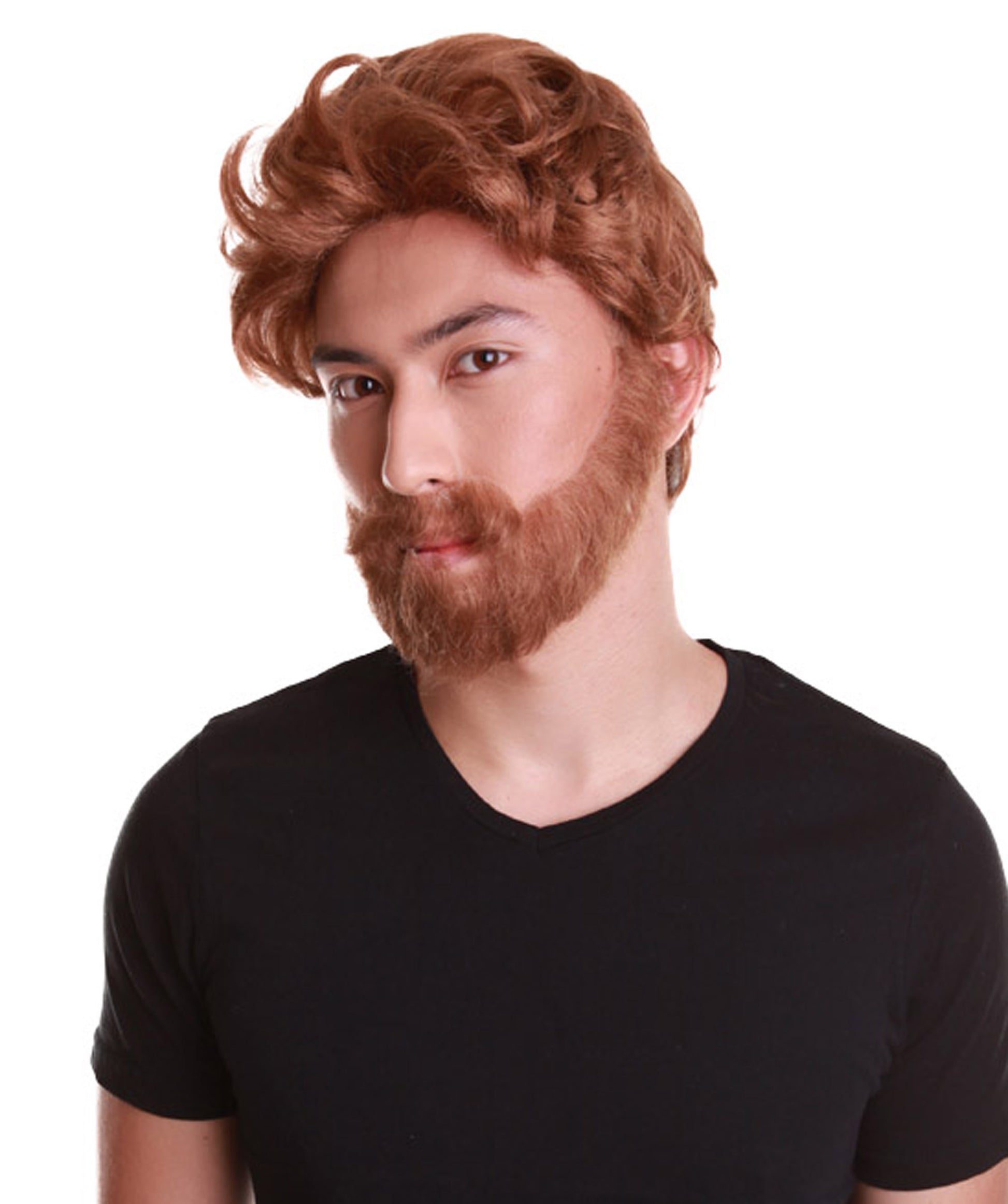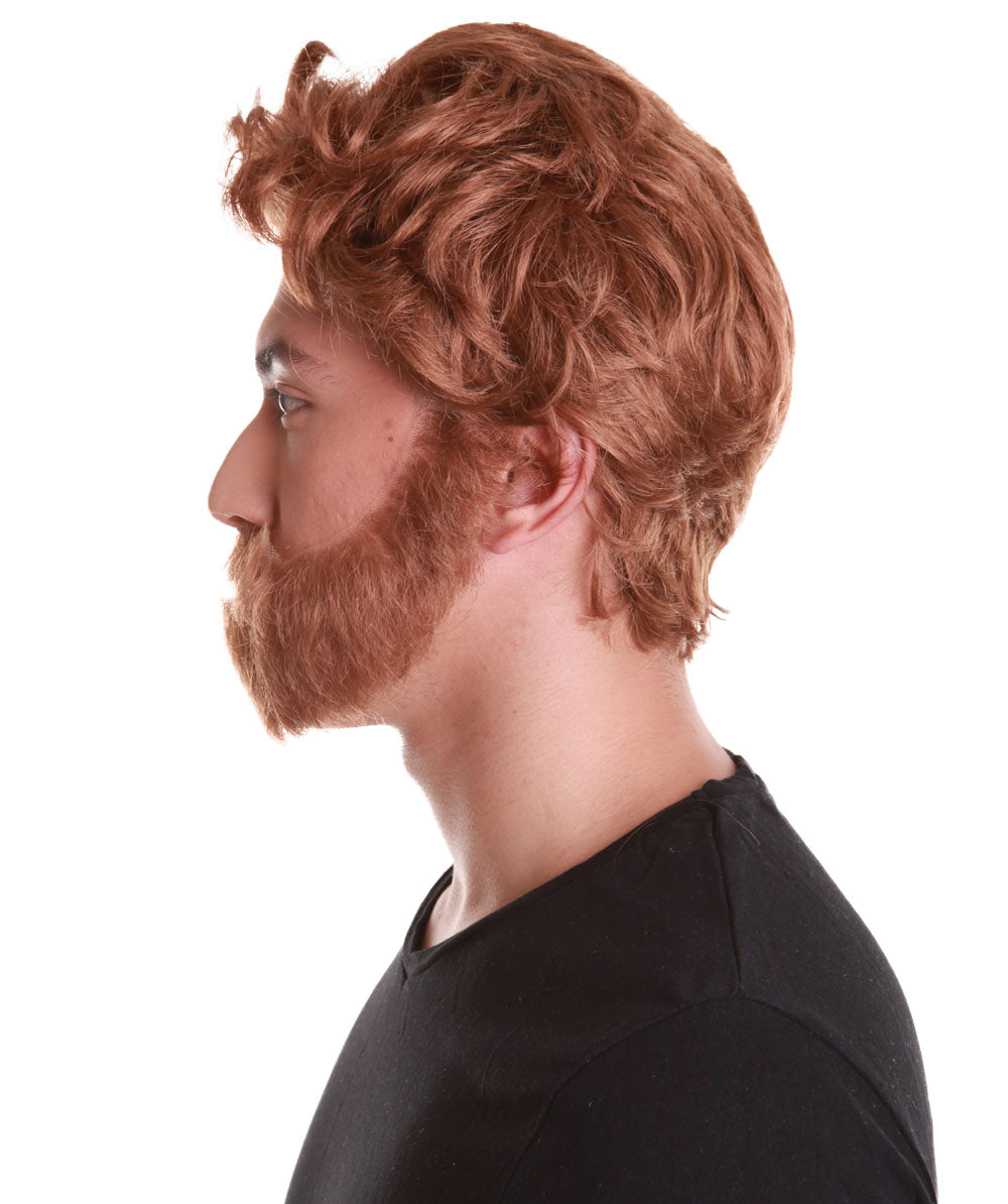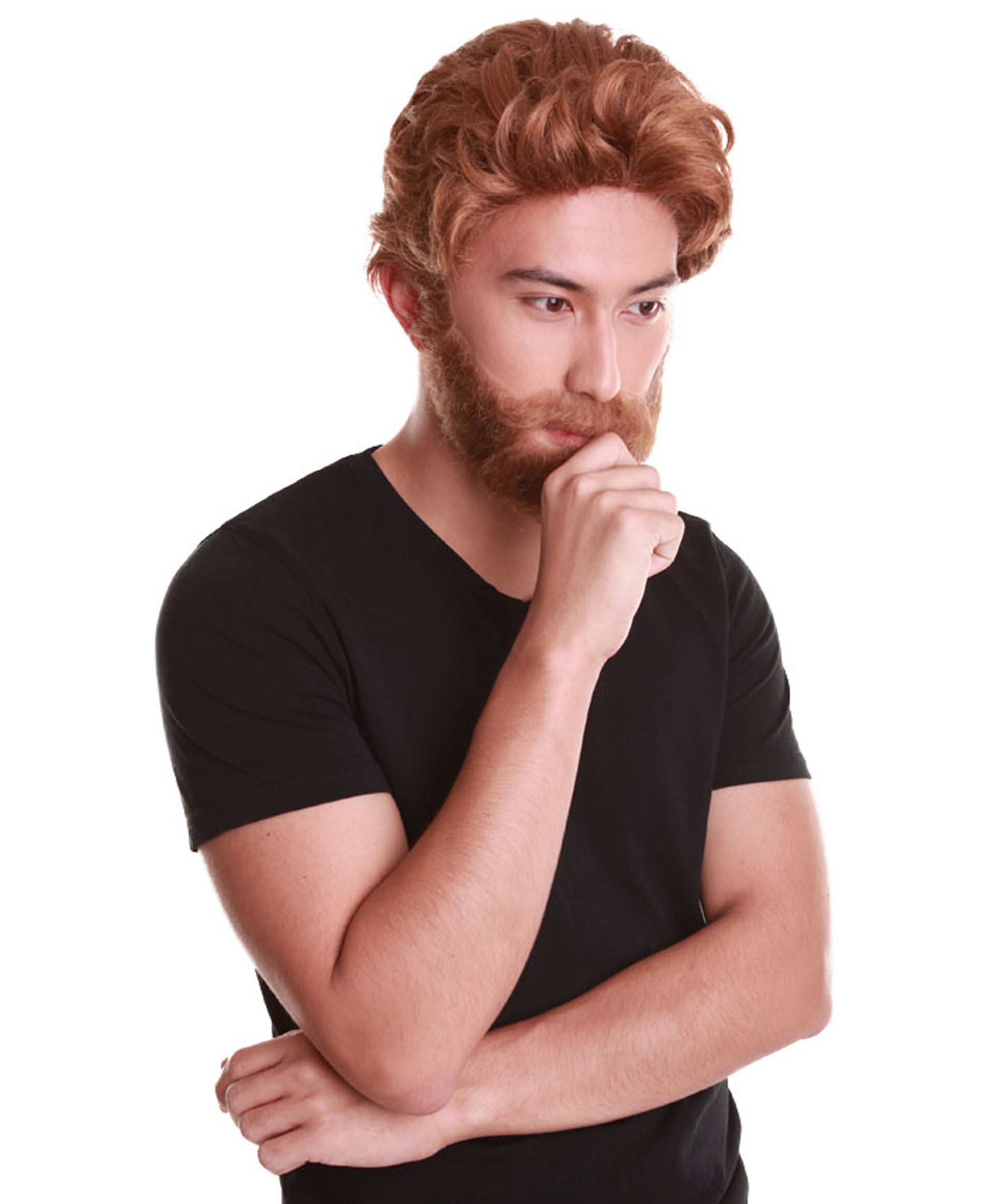 コミックスーパーヒーローブラウンカラーウィッグ、ヒゲ&ムスタッシュ付き 男性用 H-4976 プレミアム通気性キャップレスキャップ