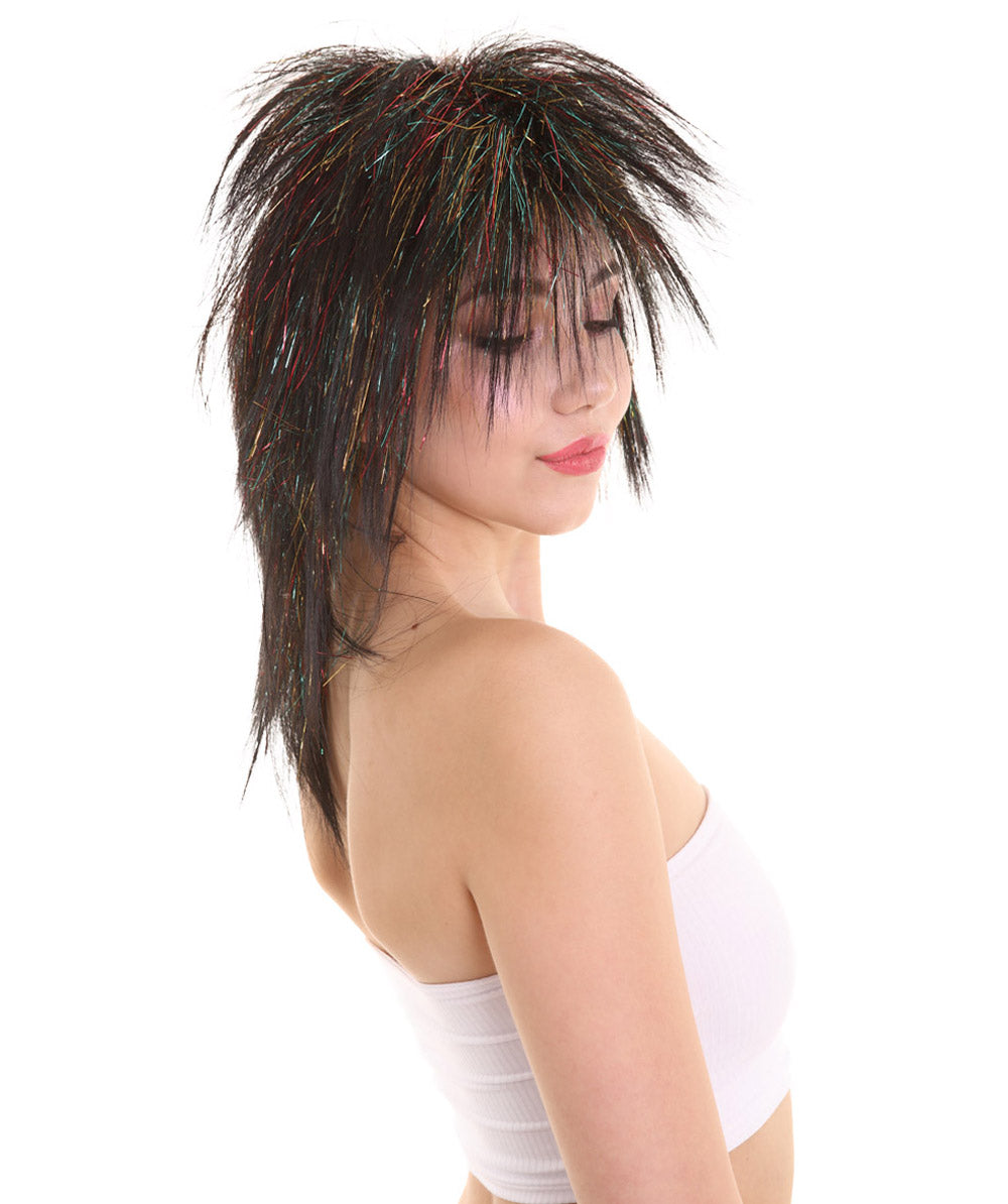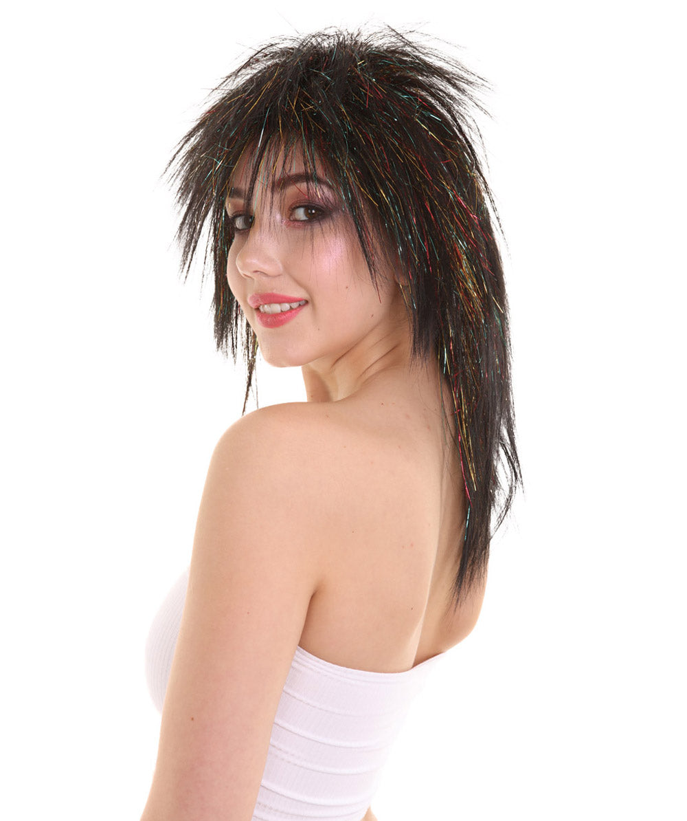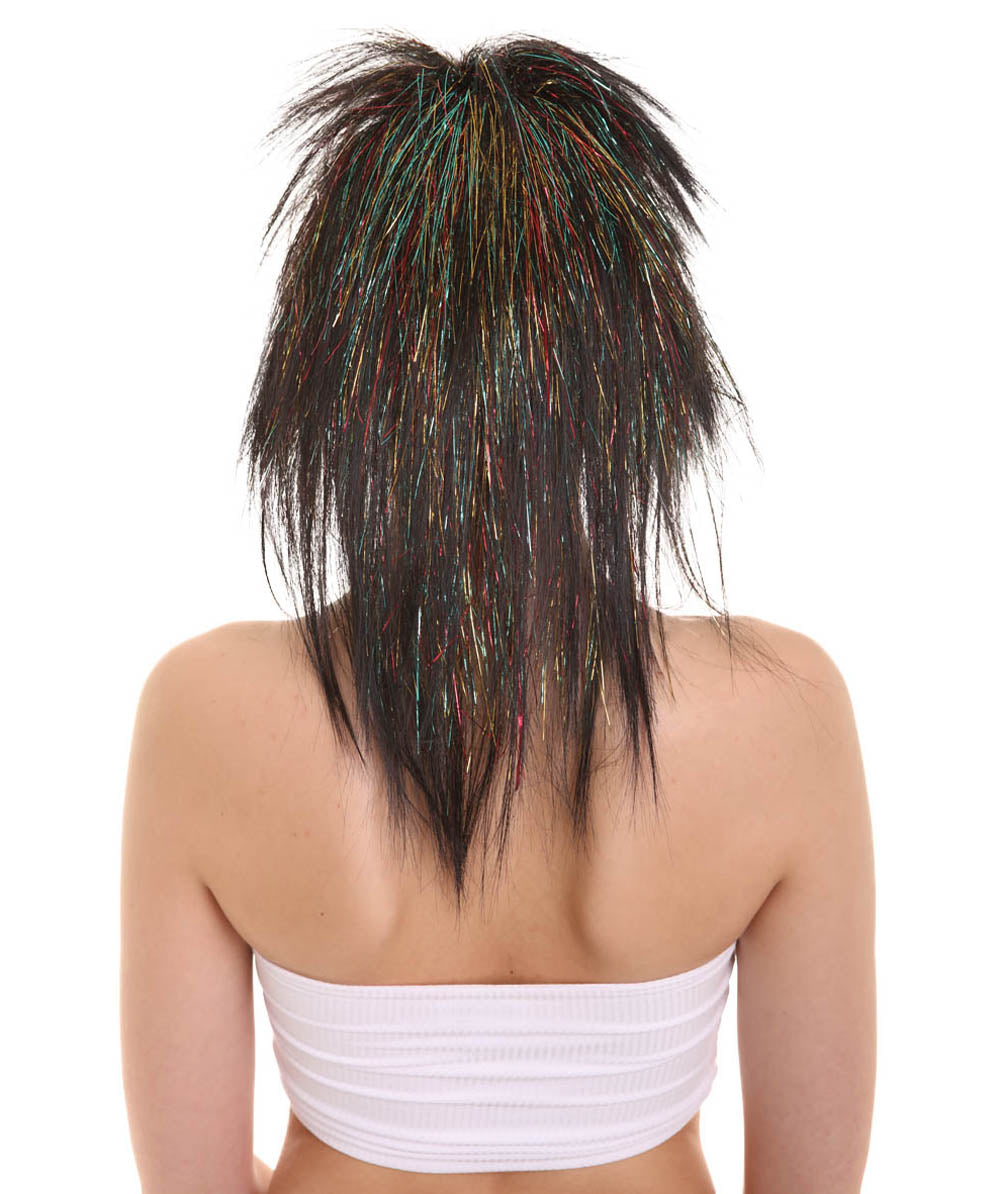 ハロウィンパーティ H-5210 女性用 ロングブラックレイブマレット 金色のキラキラハイライトウィッグ プレミアム 通気性抜群のキャップレスキャップ