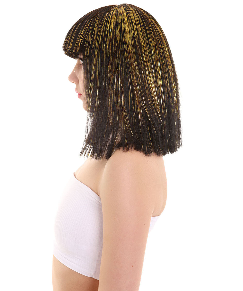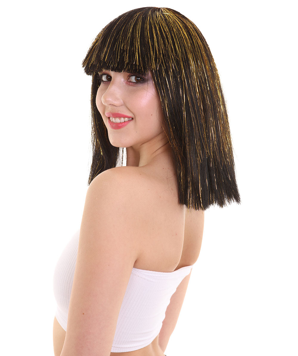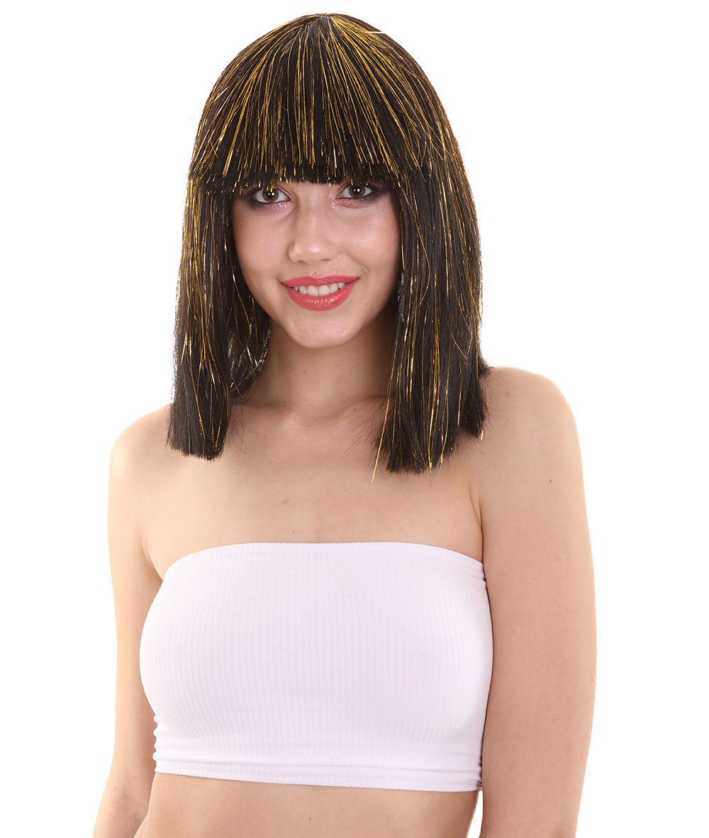 ハロウィンパーティ H-5212 女性用 ロングブラック90'sボブ 金色のティンセルハイライトウィッグ プレミアム 通気性抜群のキャップレスキャップ