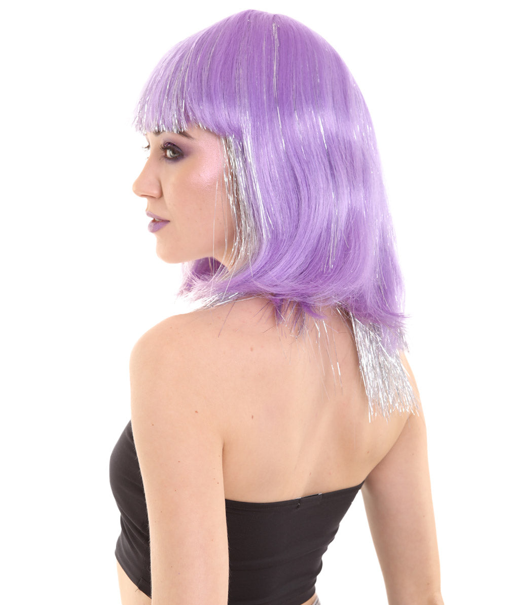 ハロウィンパーティ H-5213 女性用 ロングバイオレット90'sボブ シルバーティンセルハイライトウィッグ プレミアム 通気性抜群のキャップレスキャップ