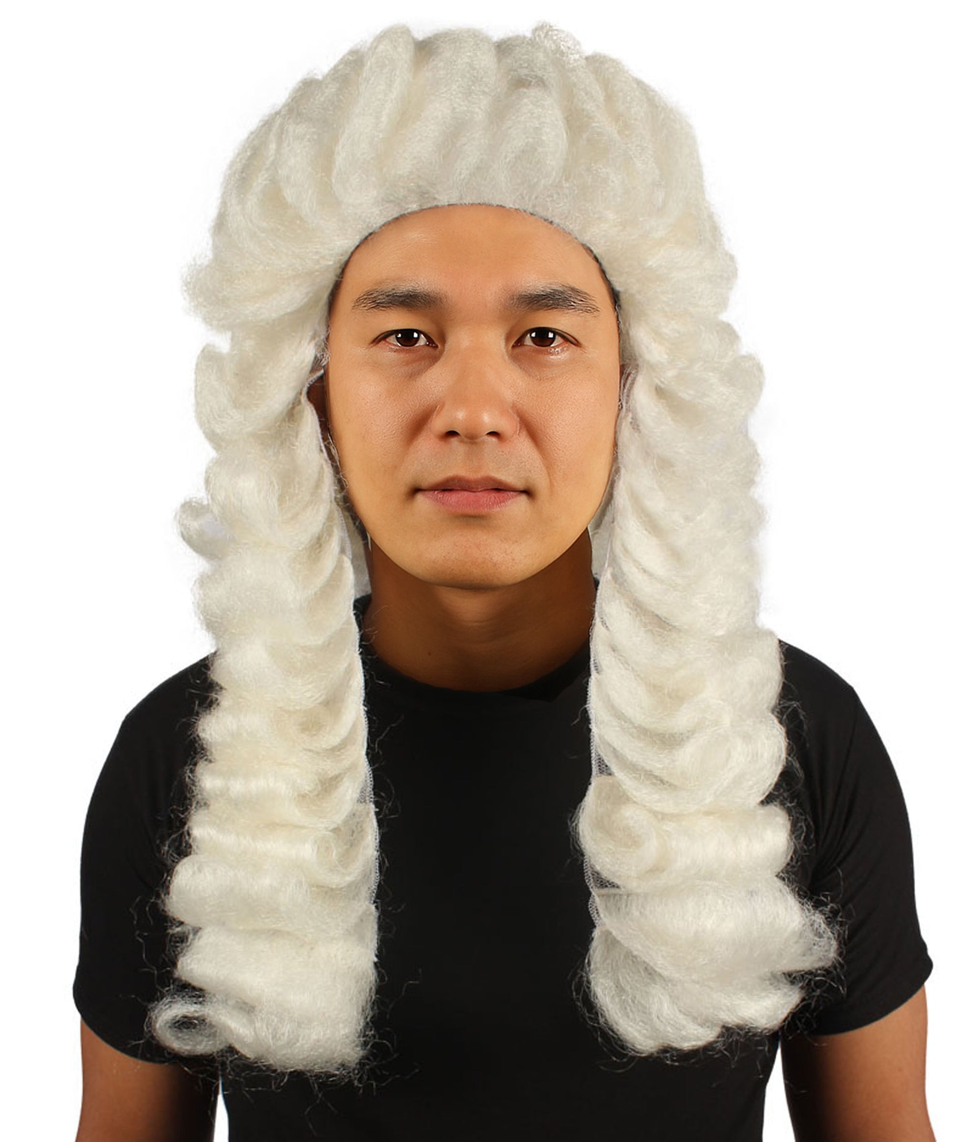 男性用コロニアル裁判官カーリーロングホワイトウィッグ H-4332 プレミアム通気性キャップレスキャップ