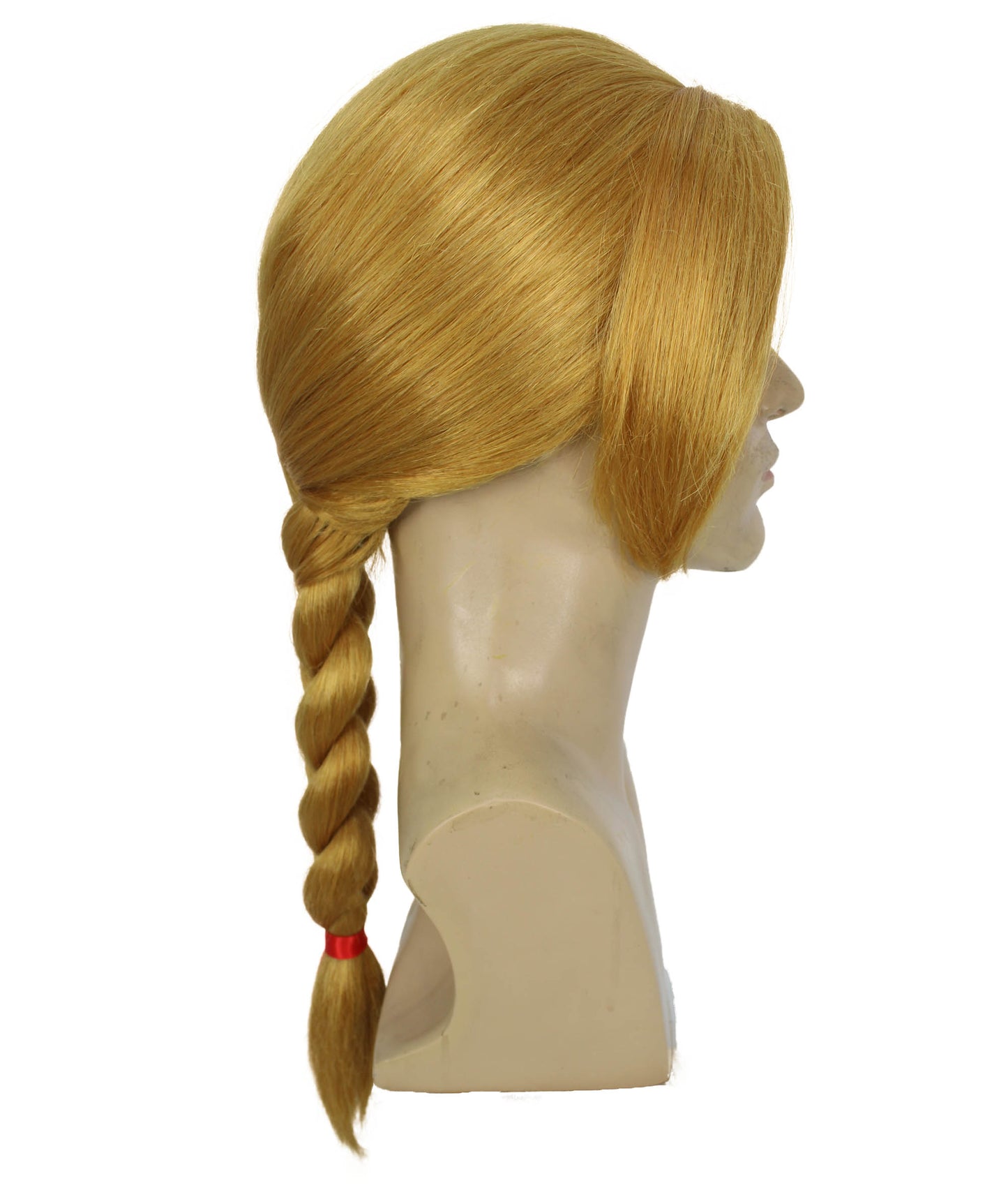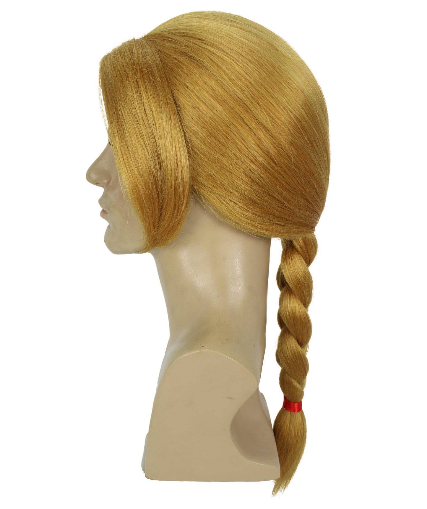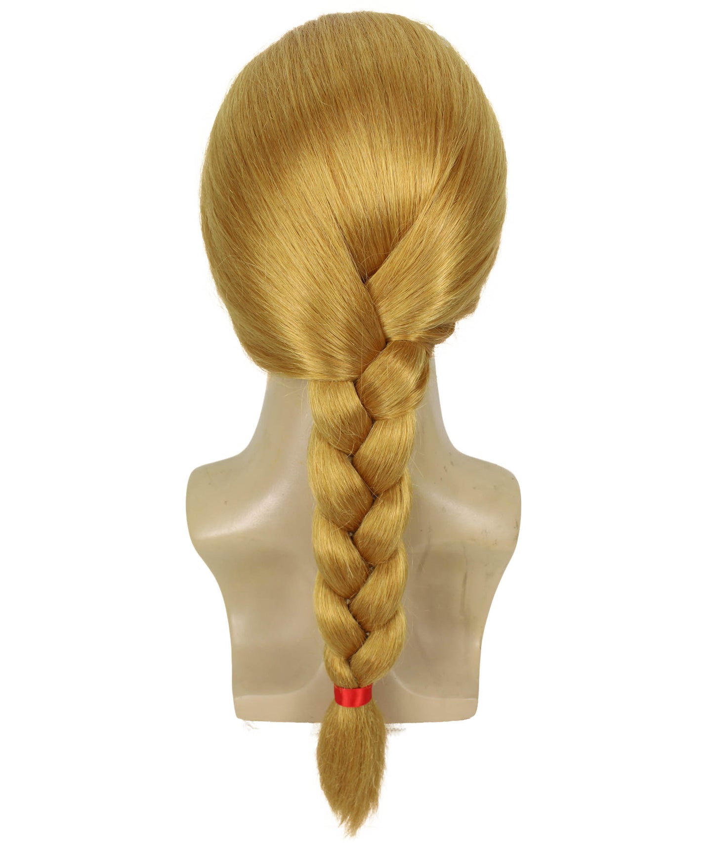 難燃性合成繊維で作られたこのブロンドの長い編み込みポニーテールウィッグには、直径 22 インチまで伸ばすことができる調節可能な裏地が付いており、大人と 5 歳までの子供の両方に最適です。