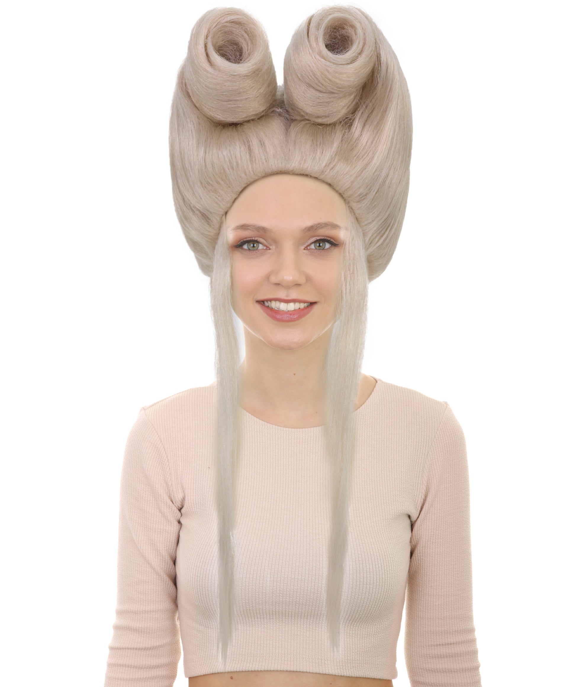 プラチナブロンドのファンタジーウィッグで、スタイル、ファンタジー、そして大胆なコスチュームのエネルギーが織りなす夢の世界へ足を踏み入れましょう。構築的なふわふわのクラウンと、なめらかに流れるようなテールが特徴です。エッジの利いたエレガンスを求める女性のためにデザインされたこのウィッグは、時代を超越したボリュームと未来的な美しさを融合させています。大胆なルックスとクリエイティブなイベントにぴったりのファンタジーウィッグ。クラウンから高く立ち上がるふわふわのヘアスタイルがドラマチックなシルエットを描き、2つの非常に滑らかなストレートテールへと細くなっています。このコントラストのあるフォルムは、ファンタジーの女王、スペースオペラのスター、あるいはアヴァンギャルドなポップディーバといったキャラクターにインスパイアされたウィッグに最適です。
